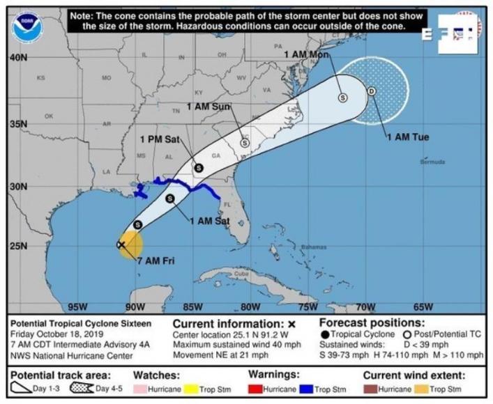 De acuerdo al boletín de las 11.00 horas (15.00 GMT) del Centro Nacional de Huracanes (NHC), el sistema se halla a unas 70 millas (115 km) al sursuroeste de Panamá City, en el llamado Panhandle de Florida, donde se espera el ciclón post-tropical toque tierra la tarde de este sábado.
